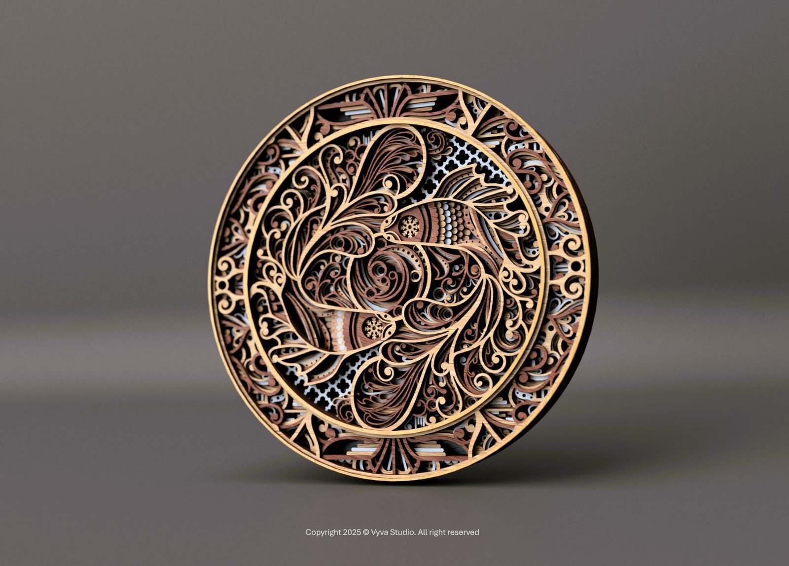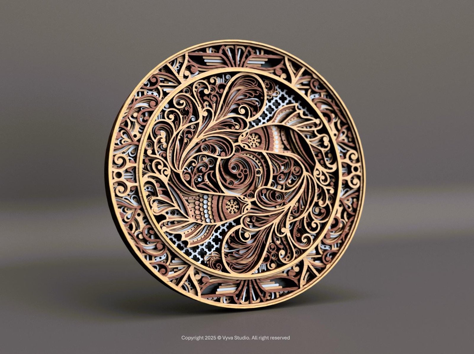 Create stunning wall décor with this intricate 3D layered Koi fish mandala laser cut file. Perfect for Glowforge, CNC, Cricut, and other laser machines. Includes SVG, AI, DXF, and PDF formats for instant download. Ideal for wood, acrylic, and MDF projects.